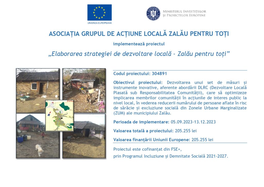 ASOCIAȚIA GRUPUL DE ACȚIUNE LOCALĂ ZALĂU PENTRU TOȚI, în calitate de beneficiar, a implementat proiectul „Elaborarea strategiei de dezvoltare locală – ZALĂU PENTRU TOȚI”, cod SMIS 304891, implementat în cadrul Programului Incluziune și Demnitate Socială 2021-2027, apelul de proiecte PIDS/40/PIDS_P1/OP4/ESO4.11/PIDS_A9, „Sprijin pregătitor pentru elaborarea Strategiilor de Dezvoltare Locală în orașe/municipii cu o populație de peste 20.000 de locuitori – regiuni mai puțin dezvoltate”.